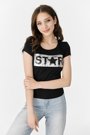 Футболка полуприлегающего силуэта, с округлой горловиной, длиной до середины бедра. Рукав втачной короткий. Горловина обработана бейкой из основного полотна. Пайетки двусторонние