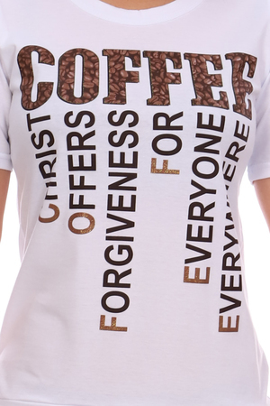 Костюм женский состоит из футболки и шорт. Футболка прямого силуэта, втачной короткий рукав. Горловина круглая, низ изделия на поясе, на полочке принт. Шорты прямые, верх на поясе с резинкой, 2 кармана, низ - подгибка.