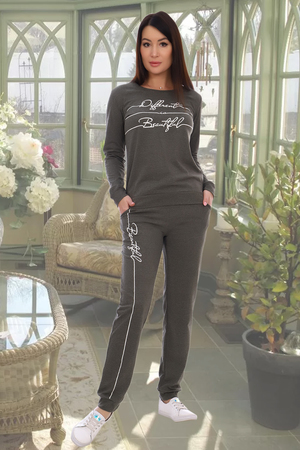 Костюм женский из кулирки состоит из брюк и кофты. Кофта прямая, горловина круглая с обтачкой, длинный рукав на манжете, низ на поясе, принт. Брюки прямые, 2 кармана, верх на поясе с резинкой, шнуром и люверсами, низ на манжете, принт