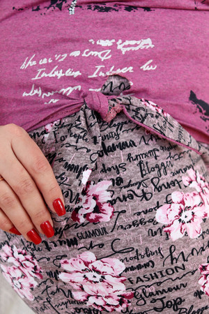 Костюм женский туника и брюки капри. Рукав цельнокроеный, короткий. Туника из однотонной ткани, на полочке принт, брюки из отделочной ткани. Вырез горловины - лодочка. Ширина туники по бедрам регулируется завязками. Горловина, низ рукава обработаны широкой окантовкой из отделочной ткани. Брюки свободные, слегка зауженные к низу, с внутренними карманами. Низ брюк заканчивается манжетой. На модели 52 размер