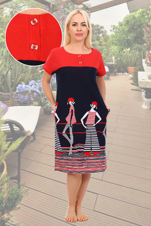Туника женская длиной до колена из набивной ткани и однотонной отделкой. Карманы в боковых швах, застежка на петли-пуговицы.