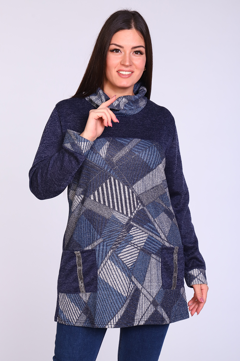 Комбинированная теплая туника прямого покроя. Ворот-хомут. Длинный рукав на манжете. Два кармана украшены декоративной лентой. Удобна, практична, красива