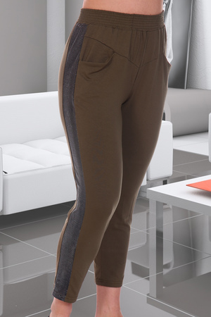Брюки полуприлегающие по бедрам к низу зауженные, на поясе. На передней части брюк кокетка и внутренние наклонные карманы. Лампасы из ткани "мунлайт". Боковые вставки могут могут быть разного цвета.