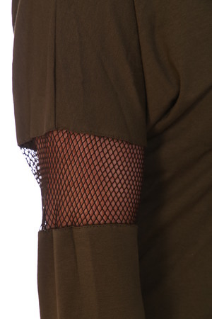 Туника женская полуприлегающего силуэта. Вырез круглый. Рукав цельнокроенный со швом. В шве вставка из сетки. Полочка слегка короче спинки, линия низа фигурная. На полочке принт "стилизованные цветы"