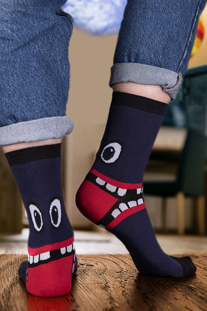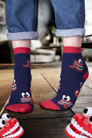 Набор мужских стилизованных носков с рисунками в виде челюстей. В упаковке 3 пары — по 1 паре каждого вида. В продаже имеются аналогичные подростковые носки Челюсти