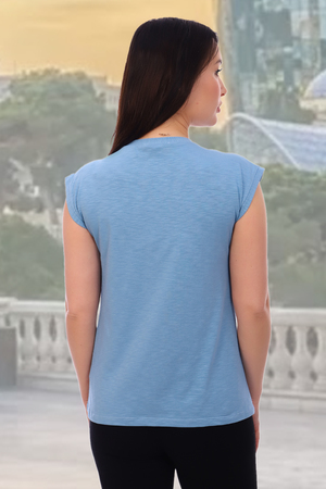 Футболка полуприлегающего силуэта с v - образным вырезом и чуть спущенной линией плеча.