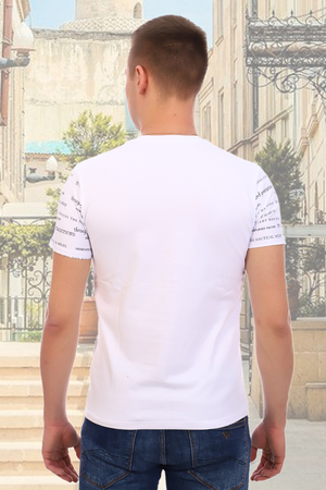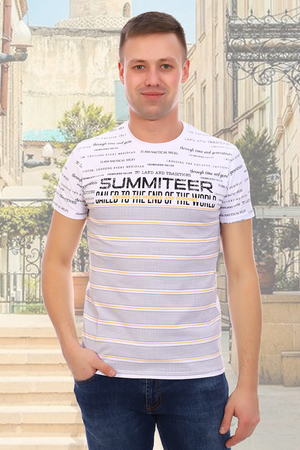 Мужская футболка из кулирки. Короткие рукава, круглая горловина, украшена печатью, прямой силуэт.