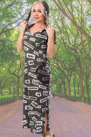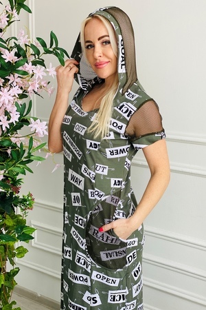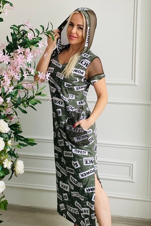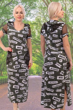 Платье женское полуприлегающего силуэта с капюшоном. На полочке рельефы и накладные карманы. Рукава короткие выполнены из сетки, по низу обработаны планкой. В боковых швах разрезы.