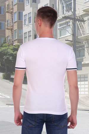Футболка прямого силуэта. Горловина декорирована треугольным вырезом со вставкой, украшена печатью и пуговицами.