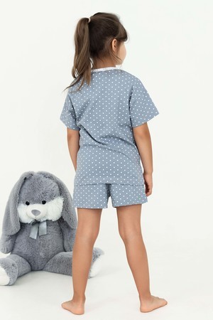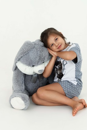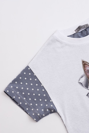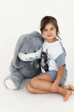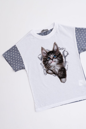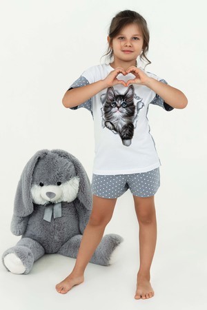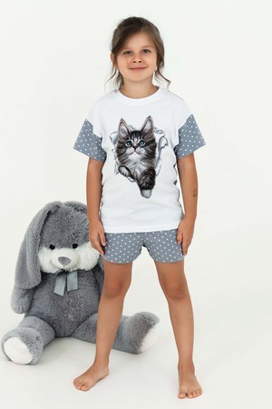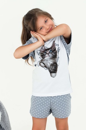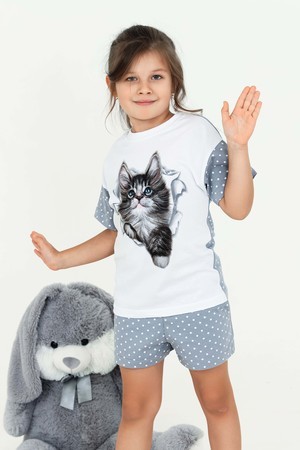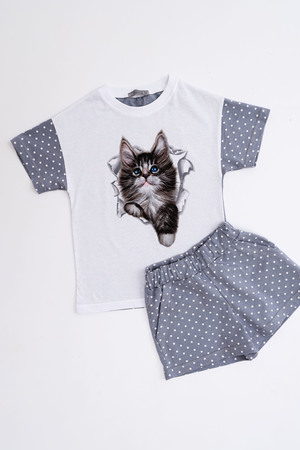 Домашний костюм для девочки с красивым котёнком Мэйкун. Рукава и спинка футболки из ткани-компаньона. Шортики свободного кроя на широком поясе с внутренними боковыми карманами.