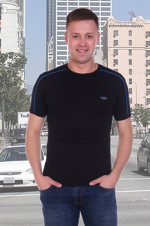 Мужская футболка из кулирки. Короткие рукава, круглая горловина, украшена печатью, прямой силуэт.