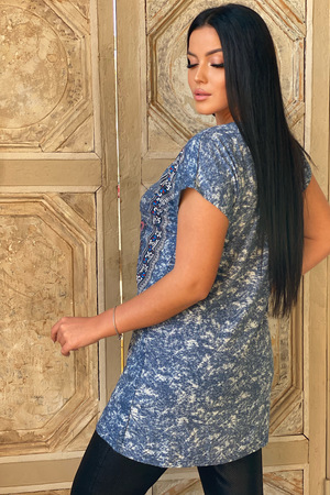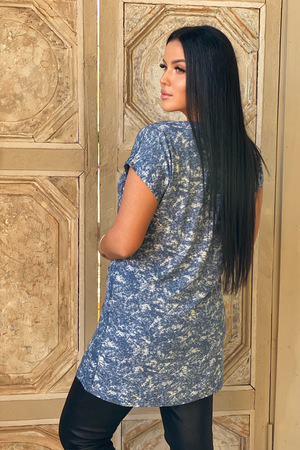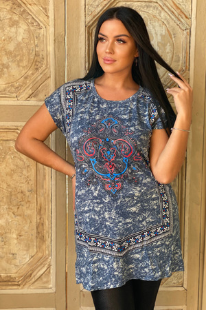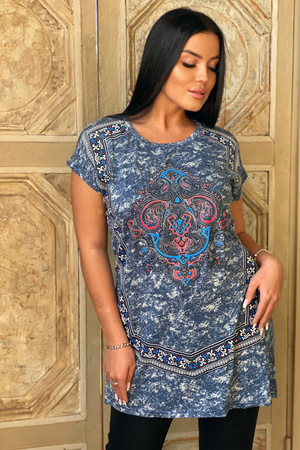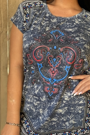 Стильная женская туника из вискозы. Рукава короткие, принт в виде растительных узоров, общая длина туники чуть ниже пояса.