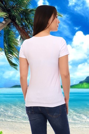 Футболка полуприлегающего силуэта, с округлой горловиной, длиной до середины бедра. Рукав втачной короткий. Горловина обработана бейкой из основного полотна.