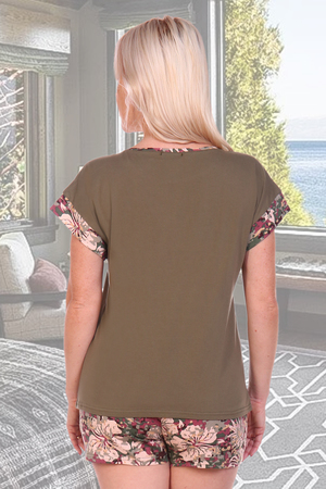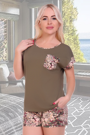 Костюм с шортами из кулирки. Футболка свободного кроя с круглым вырезом горловины, со спущенным рукавом и карманом на груди. Шорты на резинке и двумя боковыми карманами.
