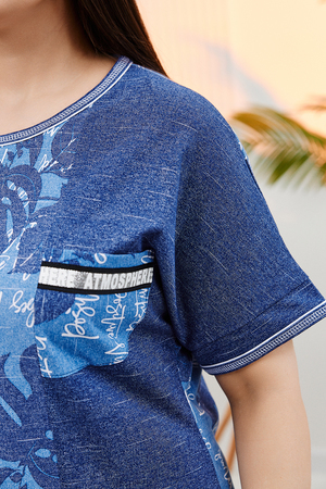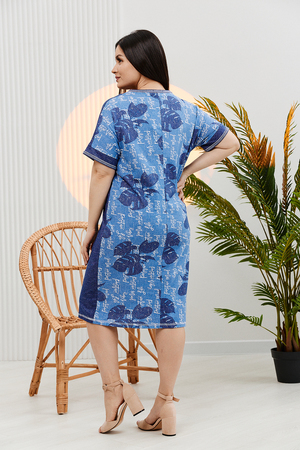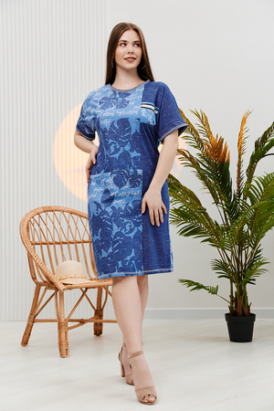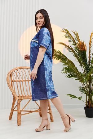 Платье женское полуприлегающего силуэта, рукав цельнокроенный короткий. Полочка состоит из трех частей. Левая боковая часть из контрастной отделочной ткани, сверху расположен нагрудный карман с настроченной на него тесьмой. С правой стороны полочки в горизонтальном шве внутренний карман. Круглый вырез горловины и манжеты рукава окантованы бейкой из отделочной ткани и белым кантом.