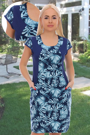 Туника женская из кулирного полотна, прямой силуэт, горловина обработана обтачкой, рукав короткий втачной, центр полочки из отделочного полотна, в боковых швах рельефы и два внутренних кармана, низ изделия обработан на плоскошовной машине.