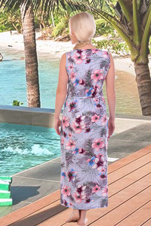 Платье длинное в пол из набивного кулирного полотна, горловина круглая, без рукава, обработана окантовкой, на талии шлевки с поясом, в боковых швах разрезы, низ изделия обработан на плоскошовной машине.