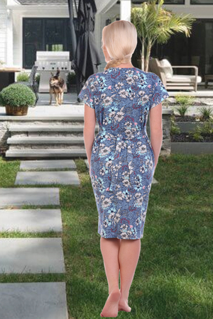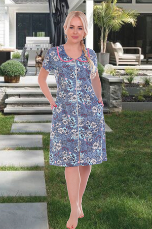 Халат женский из набивного кулирного полотна прямого силуэта. Распашной, застежка-молния. Горловина круглая с воротничком. Рукав короткий втачной. На талии в боковых швах два хлястика на завязку. Два внутренних боковых кармана. Воротник и вход в карман обработаны окантовкой в цвет отделки. Низ изделия обработан на плоскошовной машине.