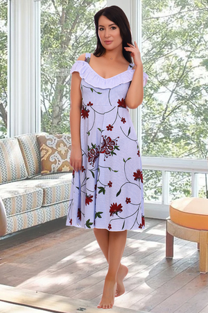 Сарафан женский расклешённого силуэта на широких бретелях, с отрезной кокеткой чуть выше линии талии. Кокетка переда с вытачками в области груди. Горловина полочки и спинки V-образной формы, обработанные при помощи широкой рюши. Пройма изделия обработана при помощи окантовки. Низ изделия - декоративный краеобмётачный шов.