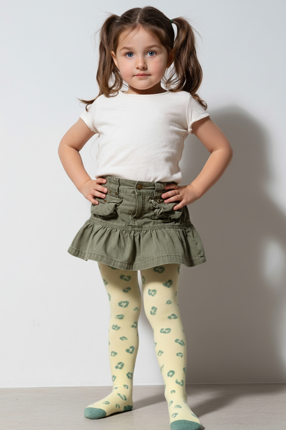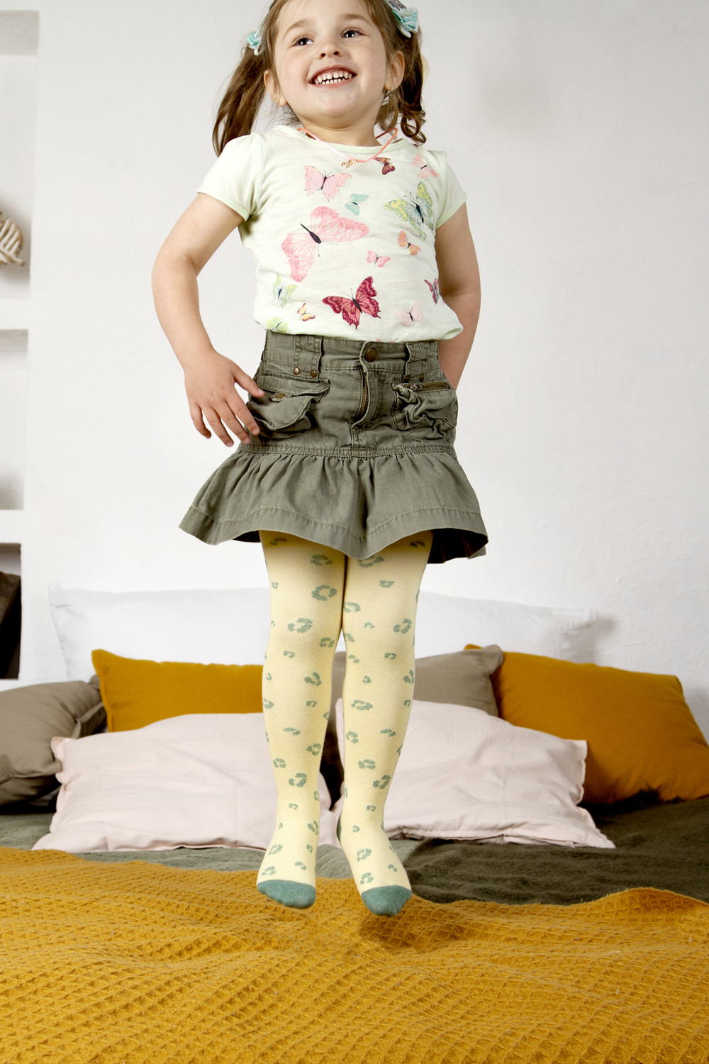 Детские колготки с вывязанными пятнышками. Сзади вывязана мордочка леопарда в кепке.