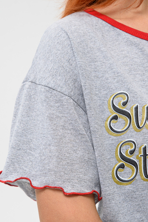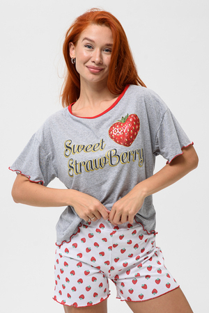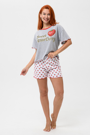 Весёлая, лёгкая пижамка "сладкая клубничка". Очень свободный крой, спущенная пройма. Может использоваться как домашний костюм. Футболка х/б 50%, ПЭ 50%; шорты х/б 100%