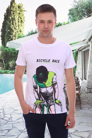 Футболка прямого силуэта средней длины с круглой горловиной, коротким рукавом и большой печатью на передней полочке. Может быть парой детской футболке 4627; продается отдельно