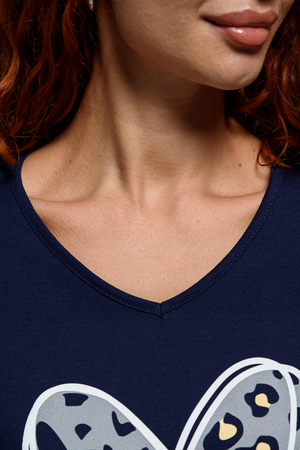 Футболка полуприлегающего силуэта, средней длины, с V-образной горловиной. Рукав цельнокроеный, короткий. Горловина и пройма обработаны бейкой из основного полотна.