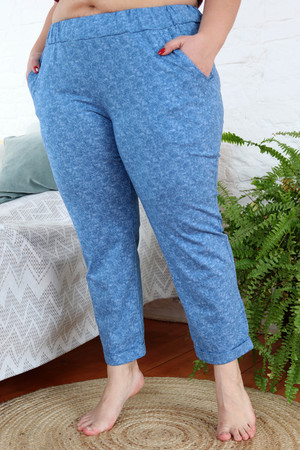 Брюки женские, свободные по бедрам, к низу зауженные, с цельнокроеными манжетами. На передней части брюк карманы. В поясе эластичная тесьма. В расцветке "огурцы" представлено несколько вариантов рисунка (представлены на фото)