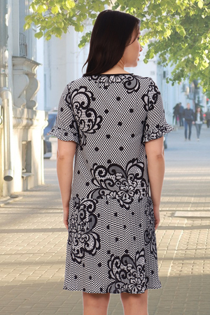 Платье прямого силуэта отрезное по линии бёдер. Верх горловины обработан кантом. Рукав втачной, короткий. Низ рукава оформлен сборкой из плиссированного полотна.