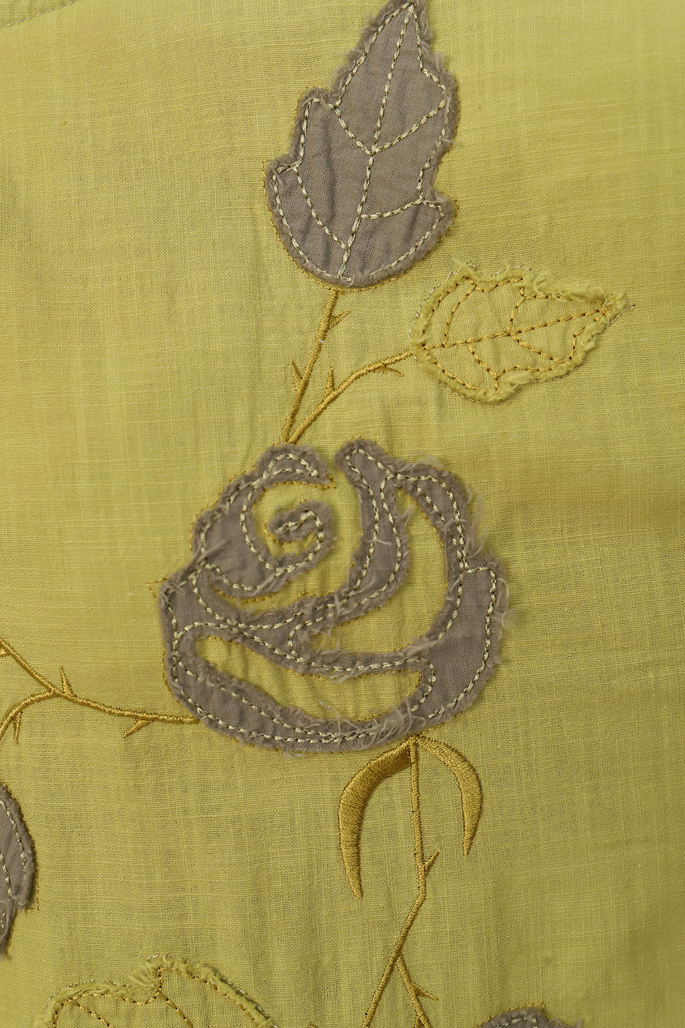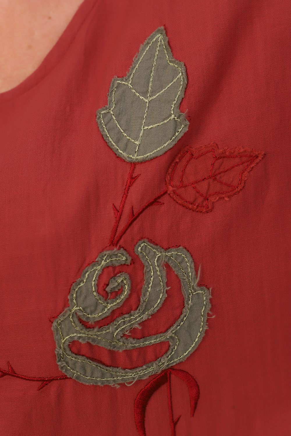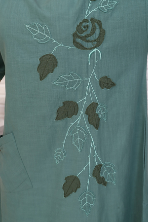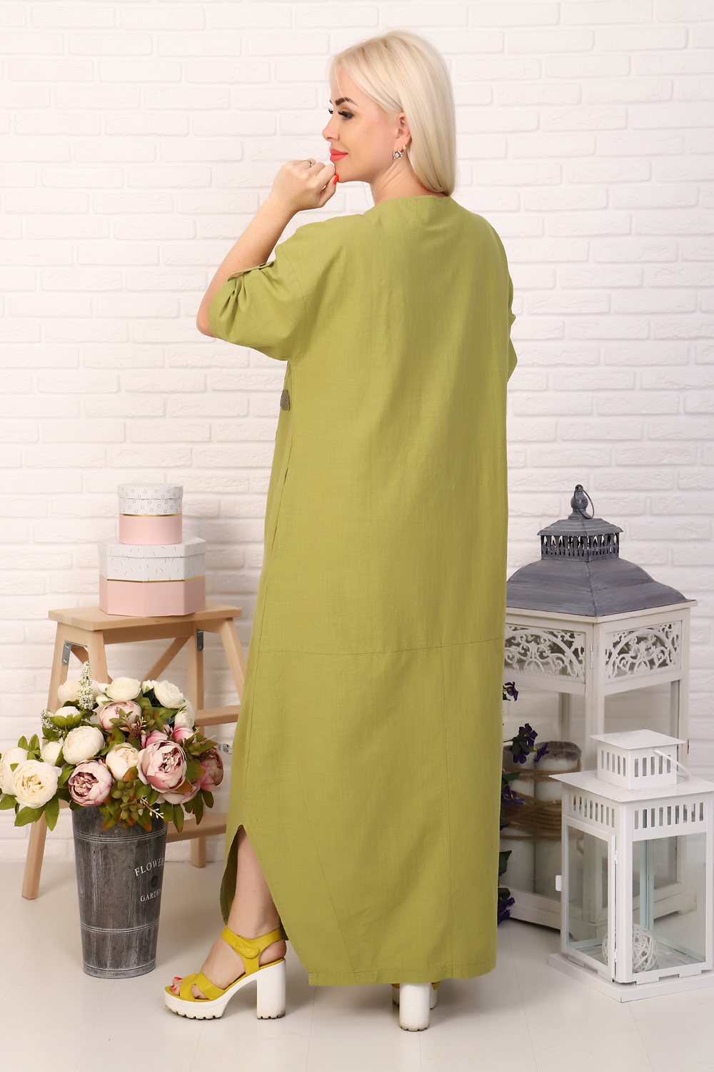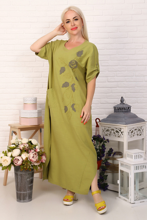 Льняное платье макси. Украшено вышивкой с аппликацией и накладным карманом.