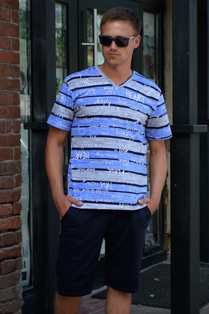Удобный мужской костюм с шортами из натуральной хлопковой ткани. Приятен к телу и не стесняет движений. Футболка прямого кроя с V-образным вырезом. Шорты средней длинны с боковыми карманами. Пояс изготовлен на поясной машине.