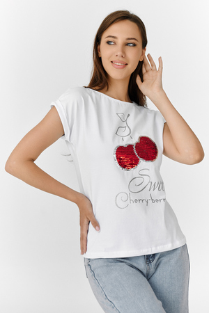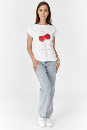 Футболка полуприлегающего силуэта, средней длины, с округлой горловиной. Рукав цельнокроеный, короткий, на манжете с отворотом.