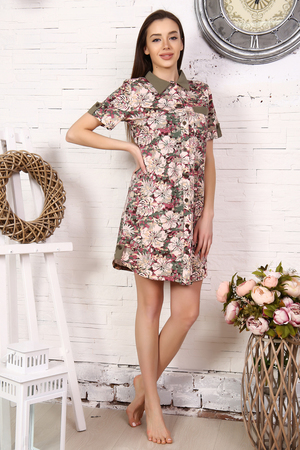 Халат женский полуприлегающаго силуэта с короткими рукавами. Сшит из кулирки. Застегивается на пуговицы. Длина халата выше колен.