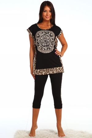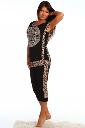 Костюм из вискозы футболка + бриджи. Черная футболка, леопардовые вставки, принт в виде этнических узоров. Черные бриджи длиной чуть ниже коленей, вертикальная леопардовая вставка сбоку