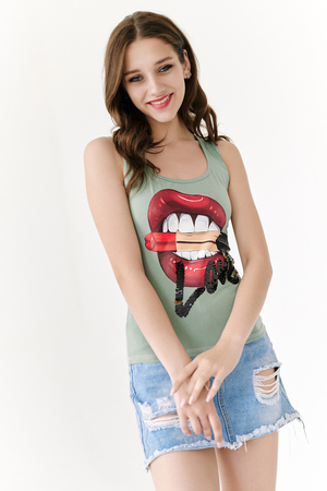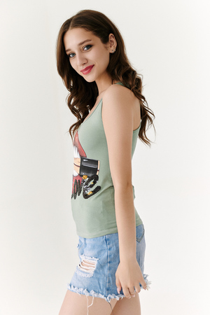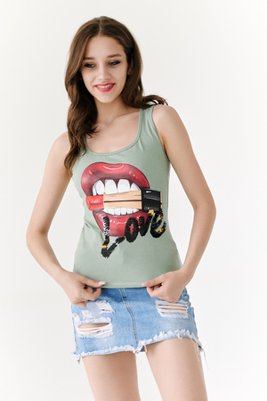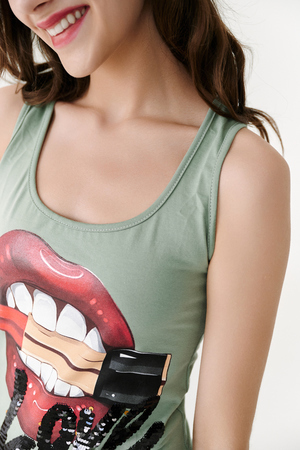 Майка-борцовка прилегающего силуэта, средней длины, с округлой горловиной. Горловина и проймы майки обработаны бейкой из основного полотна.