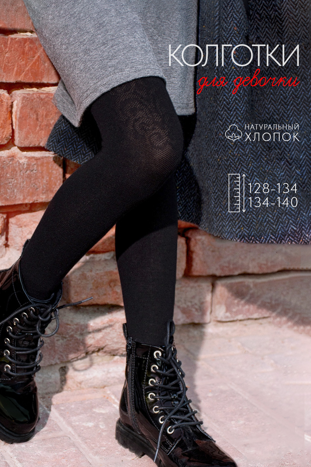Стильные колготки для подростков. Однотонная гладкая поверхность, по верху кружевной узор - имитация чулка. Лаконичный, но в то же время оригинальный дизайн отлично подходит для школы.