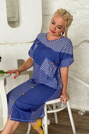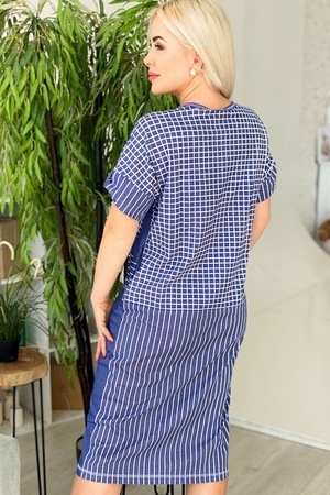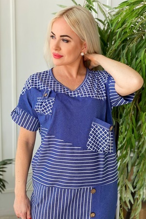 Платье женское прямого силуэта из кулирки. Рукав цельнокроенный с манжетой. В платье удачно сочетаются три вида ткани: однотонная, полоса и клетка. Верхняя часть полочки состоит из трех частей, нижняя - из двух. На средней части полочки два накладных кармана. В боковом шве расположены внутренние карманы. Рельеф в нижней части полочки украшен четырьмя пуговицами, заканчивается разрезом.