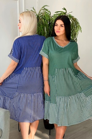 Платье женское полуприлегающего силуэта, к низу расширенное. Рукав цельнокроенный с разрезом, на манжете. Y-образный вырез обработан косой бейкой из ткани в клетку. Низ платья из двух ярусов, расположенных на разных уровнях. Средний ярус из ткани в полоску, нижний - в клетку.