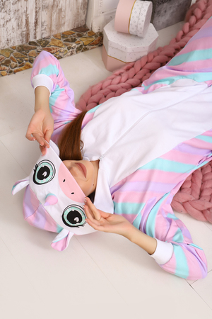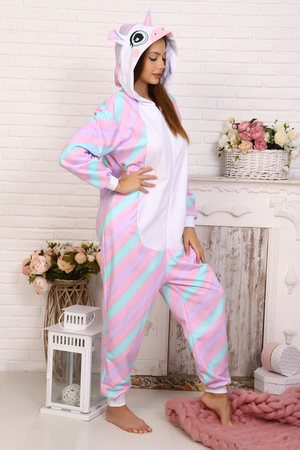 Очень мягкий и приятный на ощупь комбинезон-пижама из футера. Это лучший выбор для крутой вечеринки или повседневной одежды для сна. Комбинезон изготовлен из теплого материала, который легко стирается, не линяет, не теряет цвет и классно выглядит в течение долгого времени. Имеет застежку на молнии и капюшон в виде мордочки единорога.
