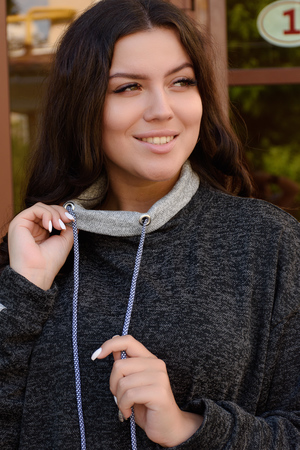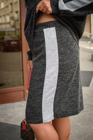 Костюм женский в стиле спортшик, состоящий из джемпера-толстовки и юбки. Материал - трикотажное полотно сандра, с лицевой стороны теплый на ощупь, тона приглушенные за счет меланжированной структуры нитей, а изнанка гладкая, приятная к телу. Костюм сшит из тканей-компаньонов, основной цвет - антрацит, на рукавах и по бокам юбки - вставки светло-серого цвета. Воротник-хомут выполнен из отделочной ткани, дополнен декоративным шнуром. Силуэт толстовки объемный, прямой крой, плечо спущено. Юбка в бедрах облегает фигуру, пояс на резинке, длина юбки выше колена. Практичная ткань, лаконичный дизайн, современные пропорции - в этом костюме есть все, чтобы Вы чувствовали себя в любой ситуации непринужденно и раскованно.