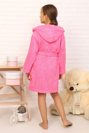 Халат махровый детский "Элит". Модель с капюшоном, втачными рукавами и накладными карманами, с поясом в тон. Полотно, используемое в пошиве, производства Узбекистан, выполнено из мягкой кольцепрядильной пряжи. Плотность полотна 365 гр/м2. Состав 100% хлопок. Упаковка: сумка ПВХ на молнии.