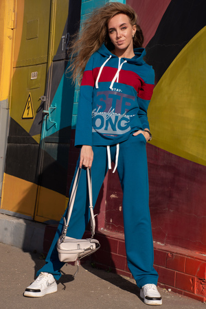 Комфорт, легкость и стильный образ - главные критерии модницы при выборе современного гардероба. Именно этот костюм подходит под это описание. Комплект состоит из толстовки и брюк. Толстовка классического кроя, с капюшоном, застёжка на молнию, втачной длинный рукав. На полочке и рукаве вставки из отделочного полотна, имеется принт. Брюки прямого кроя, с карманами, в поясе кулиска.