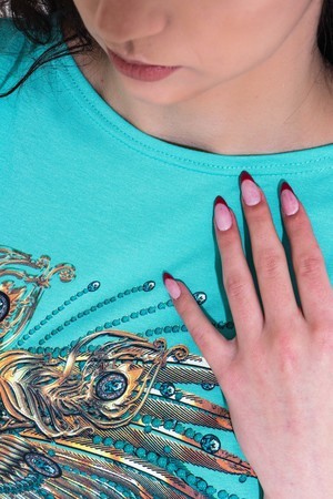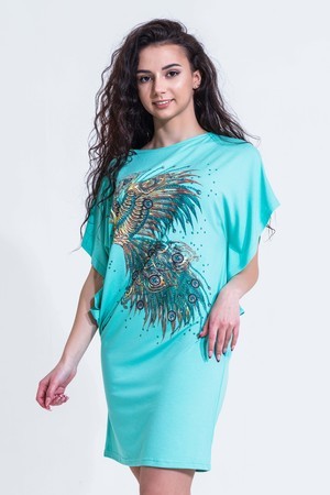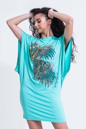 Туника из вискозы с широкими рукавами. Принт в виде сказочной птицы с орнаментами, общая длина до середины бедра, рукав короткий. Пять расцветок — бирюзовая, малиновая, ментоловая, фуксия и шоколадная