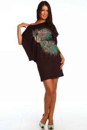 Туника из вискозы с широкими рукавами. Принт в виде сказочной птицы с орнаментами, общая длина до середины бедра, рукав короткий. Пять расцветок — бирюзовая, малиновая, ментоловая, фуксия и шоколадная