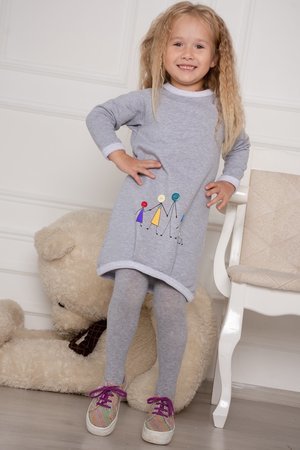 Современная модель детского платья с принтом в виде дружной семьи, декорировано разноцветными пуговицами. Платье с округлой горловиной, длинный рукав-реглан с манжетом, со встречными складками по низу переда и спинки. Горловина и низ обработаны широкой обтачкой. Платье теплое, приятное к телу, отличный вариант как повседневный , так и праздничный для маленьких модниц в любое время года.