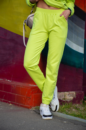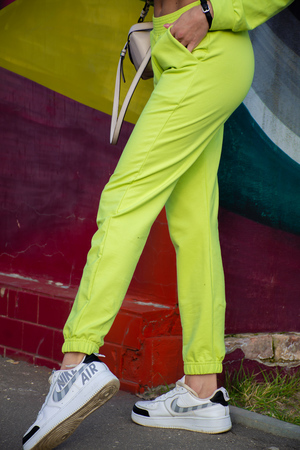 Брюки на поясе, с карманами, с резинкой по низу.