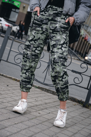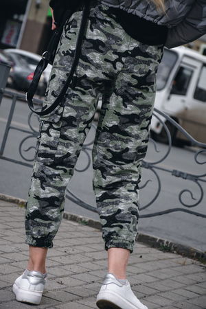 Женские брюки свободного кроя в стиле "КАРГО", выполненные из стилизованного камуфляжа. Данная модель укороченная, фиксируется на талии широкой резинкой и по низу узкой. И конечно же карманы: два боковых на уровне бедра и самые основные большие вместительные накладные карманы с клапанами и отделочной лентой с полукольцами. Комфорт и свобода движения делают брюки практически незаменимыми.