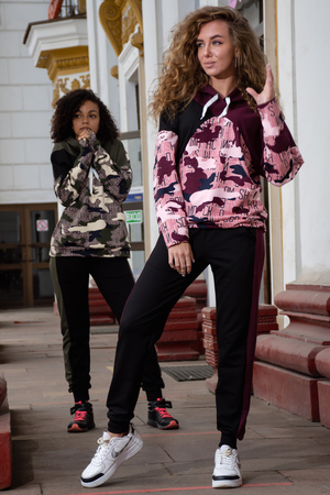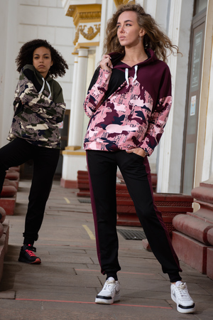 Костюм состоит из толстовки и брюк. Брюки на поясе, с карманами, с лампасами из отделочного полотна вдоль боковых швов, на эластичном манжете внизу. Толстовка прямая, свободная, с капюшоном, на поясе, длиной до середины бедра. Рукав длинный. Полочка разделена асимметричными линиями на части из отделочных контрастных полотен. На полочке обработан карман "кенгуру".