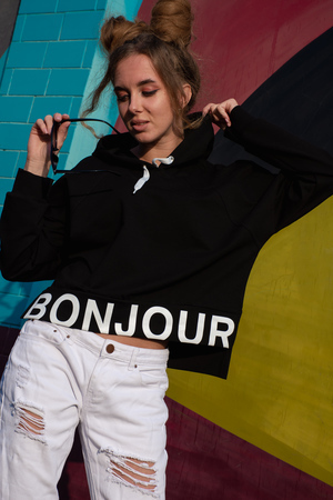 Толстовка прямая, укороченная, с капюшоном, на поясе. Рукав длинный, на манжете. Спинка удлиненная, на поясе. На полочке расположены симметричные кокетки и пояс. В нижней части боковых швов обработаны разрезы.