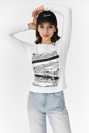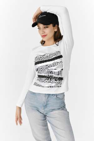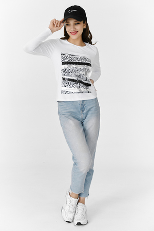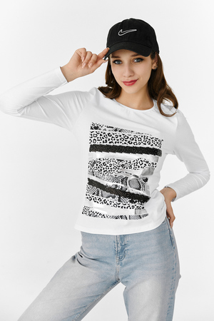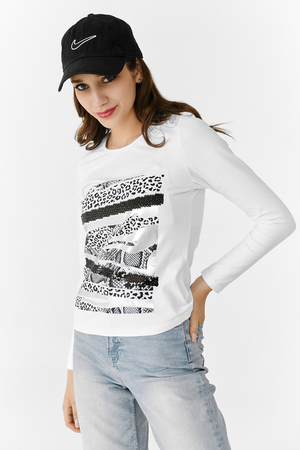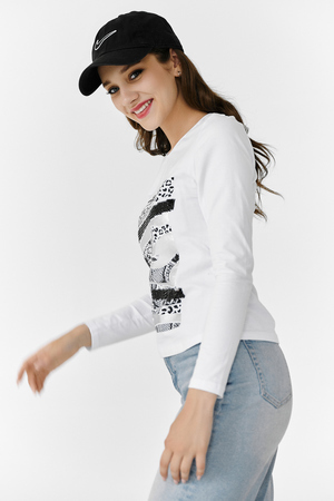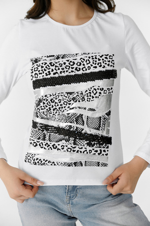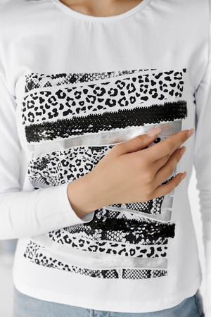 Туника полуприлегающего силуэта, с округлой горловиной, длиной до середины бедра. Рукав втачной, длинный. Горловина обработана бейкой из основного полотна. На полочке большая красивая печать с золотым или серебряным глиттером, декорированная пайетками